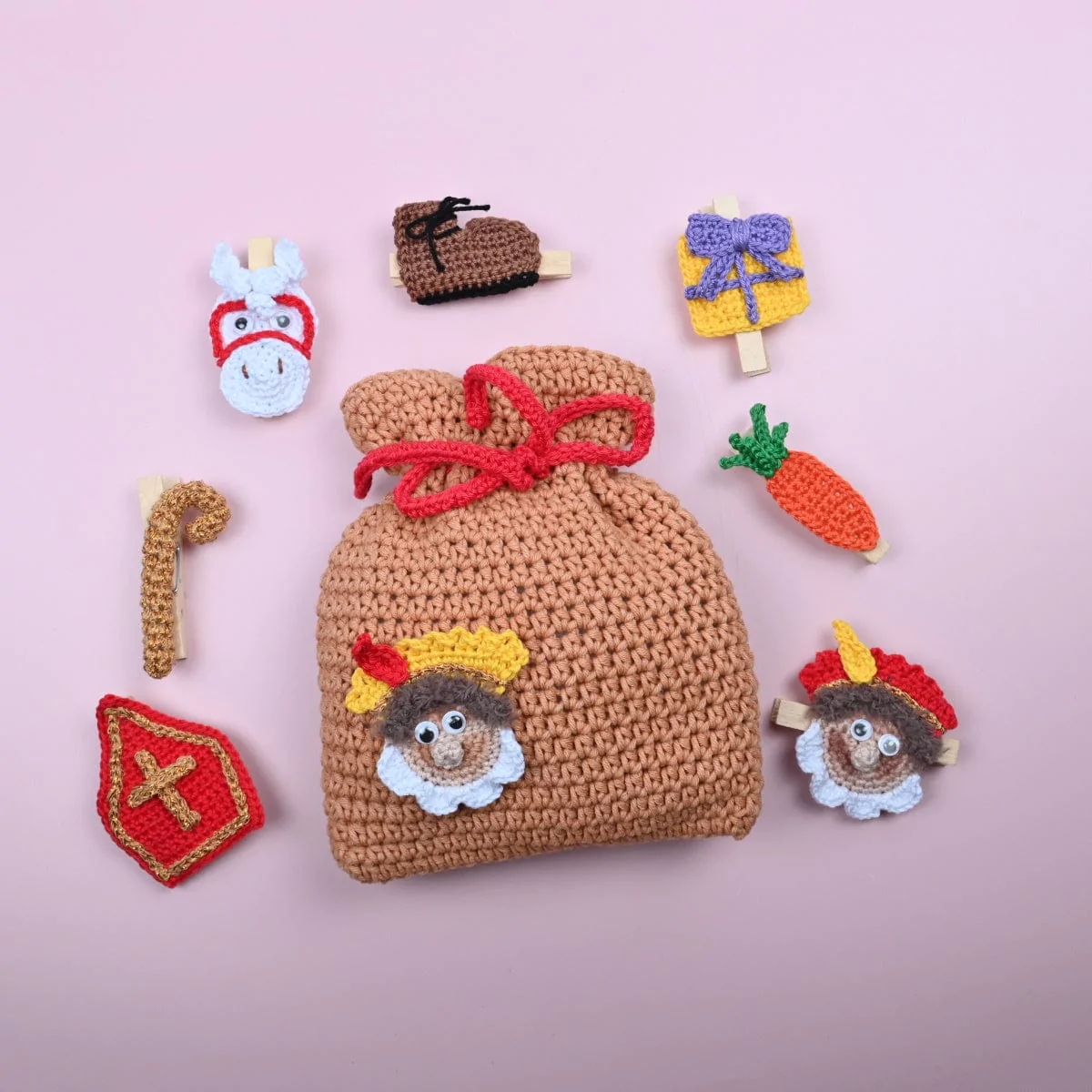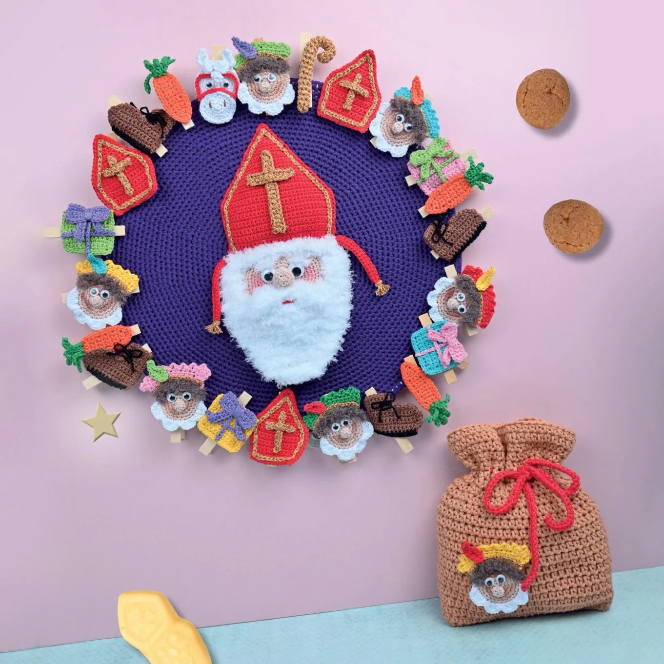 Haak jouw eigen aftelkalender! Je kunt variëren met het aantal pietjes, cadeautjes en schoentjes. In de speciale zak berg je alle knijpers eenvoudig op.