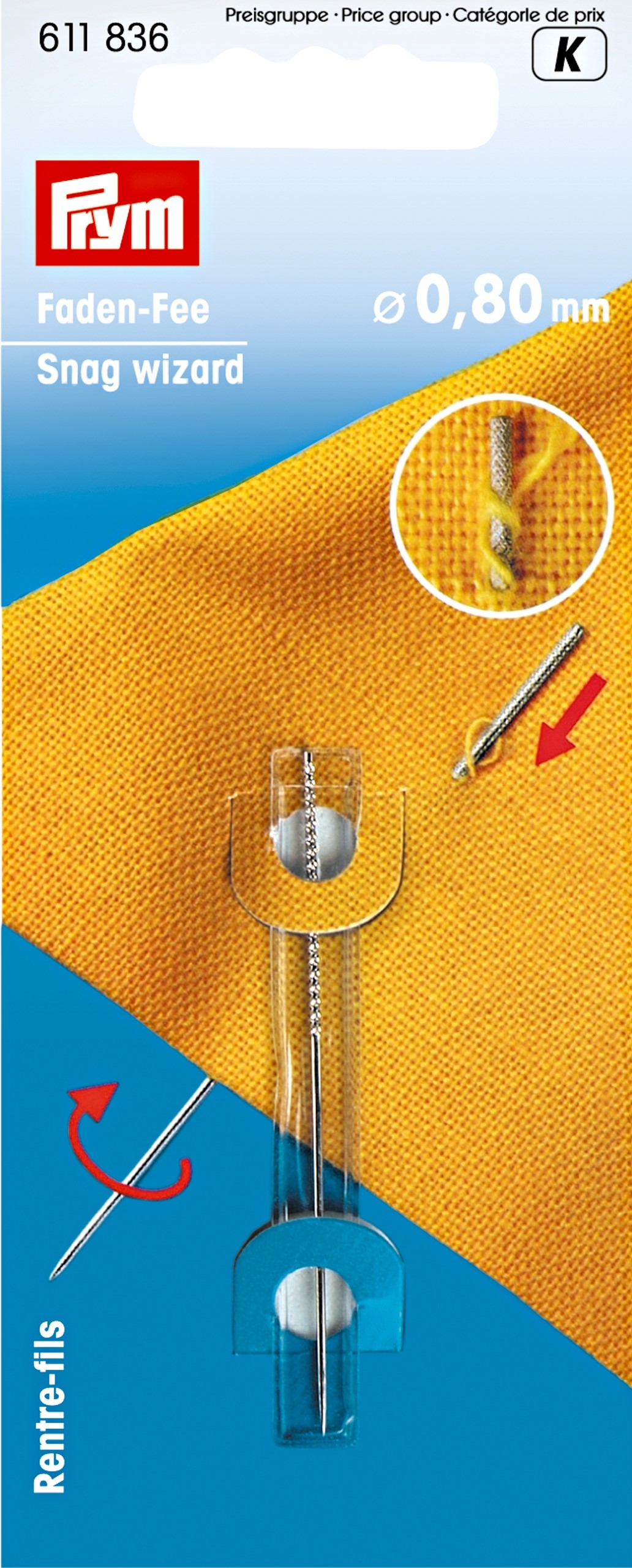 Deze draadfee of wondernaald van Prym is een zeer handig hulpmiddel om losse draadeinden in kleding weg te werken. Dit naaiaccessoire is vooral erg praktisch bij pluizige of uitgerafelde draadeinden, die u niet meer door een normaal naaldoog kunt steken. De naald heeft geen oog, maar een ruw geribbeld uiteinde. Prik de naald met de punt door de stof, naast de losse draad die u weg wilt werken. Vervolgens draait u de naald rond, waardoor de draad aan het andere, ruwe uiteinde blijft hangen. Nu kunt u de draad naar binnen trekken, en weg is het losse draadje. Door tenslotte lichtjes aan de stof te trekken in verschillende richtingen, zal het resterende gaatje zich sluiten. De draadfee is 0,80mm breed